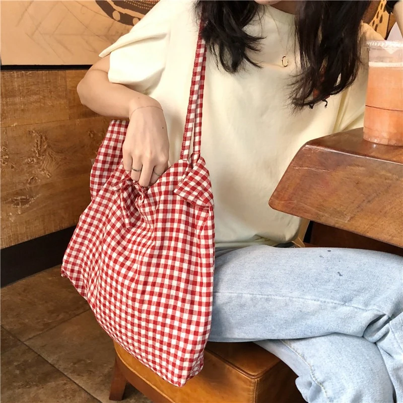 Vintage Plaid Women’s Shoulder Bags Large Capacity Female Reusable Shopping Bag Cotton Cloth School Girls Book Tote Handbags